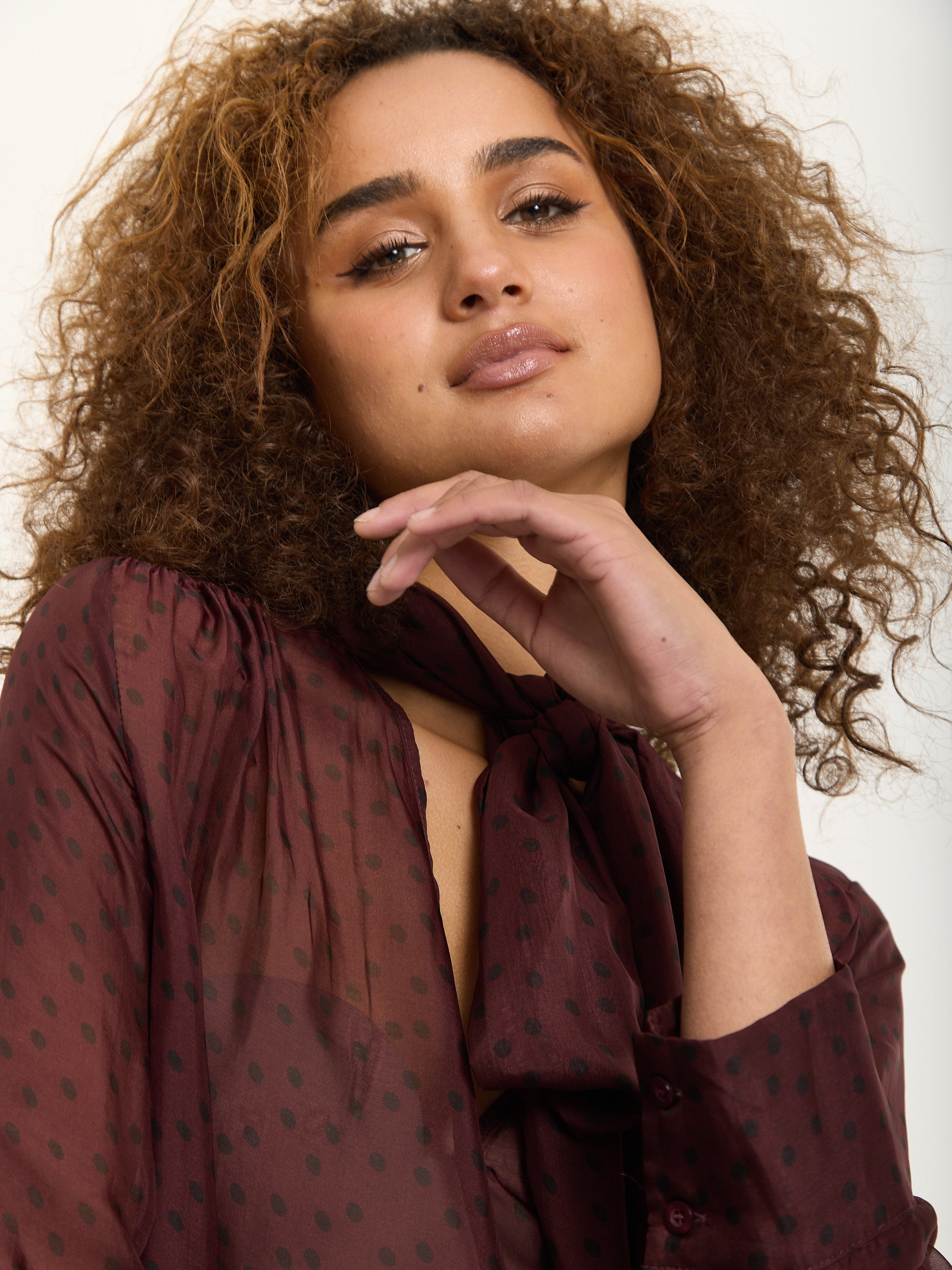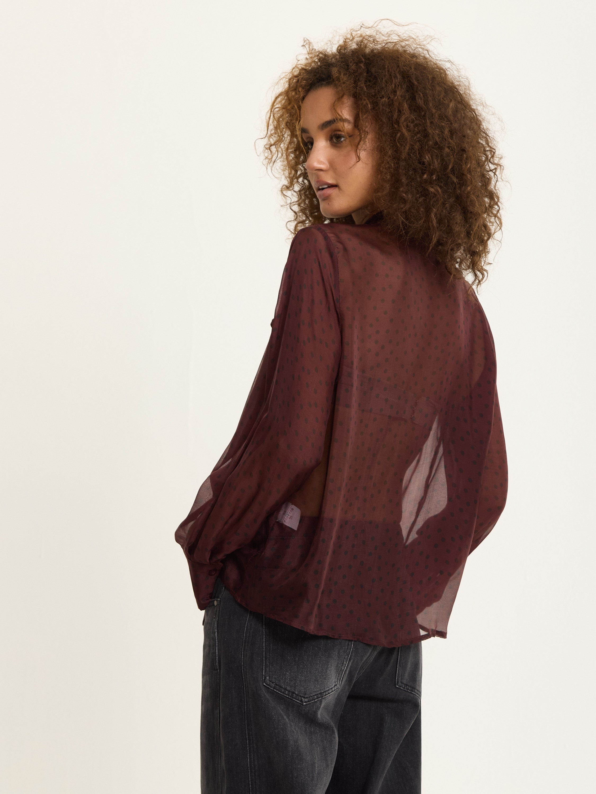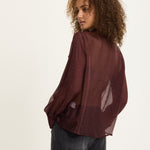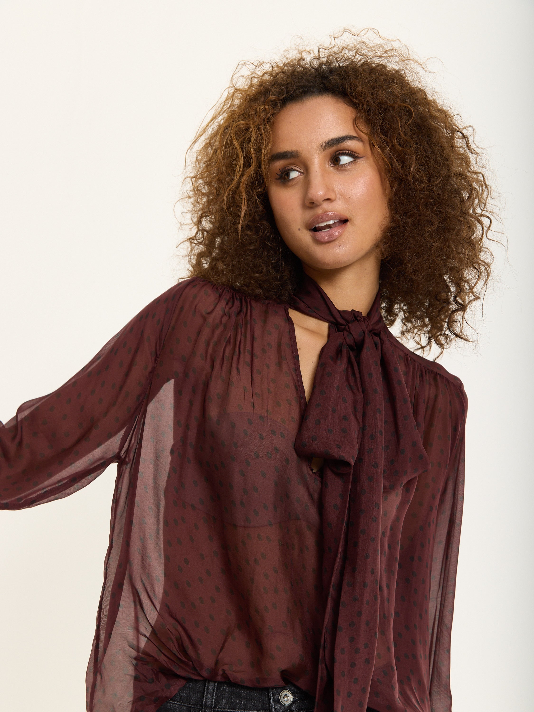 An elegant sheer blouse crafted from a luxurious silk blend, featuring a playful polka dot print in deep burgundy. The design includes a soft pussy bow neckline, gathered shoulders, and buttoned cuffs for a romantic, vintage-inspired finish.