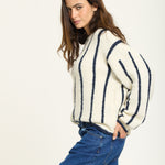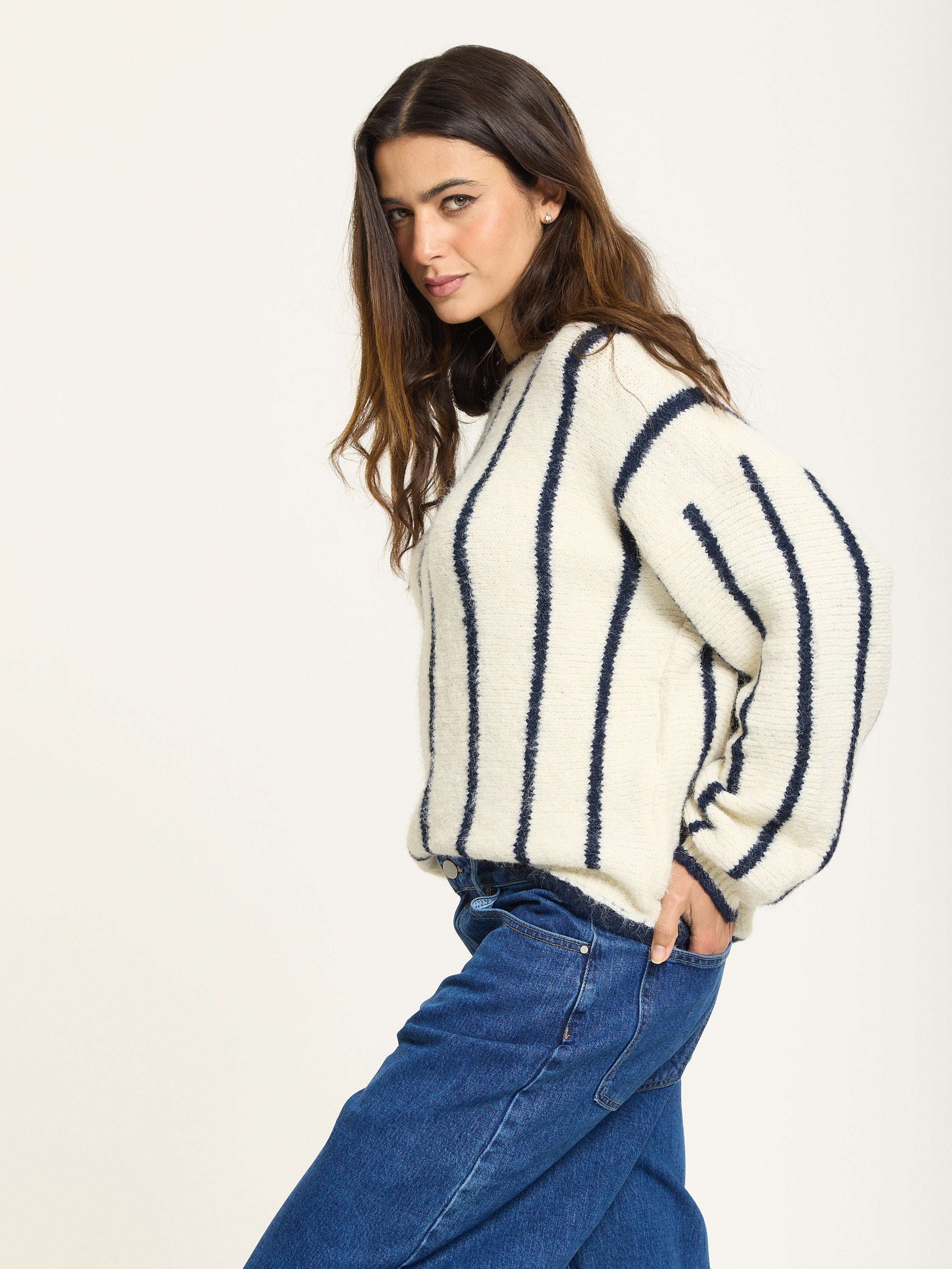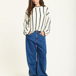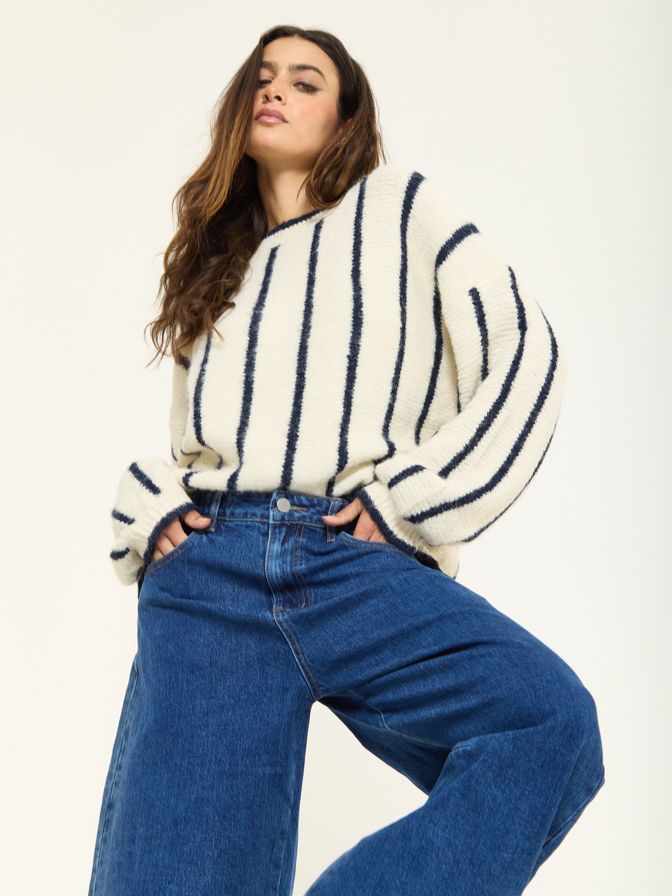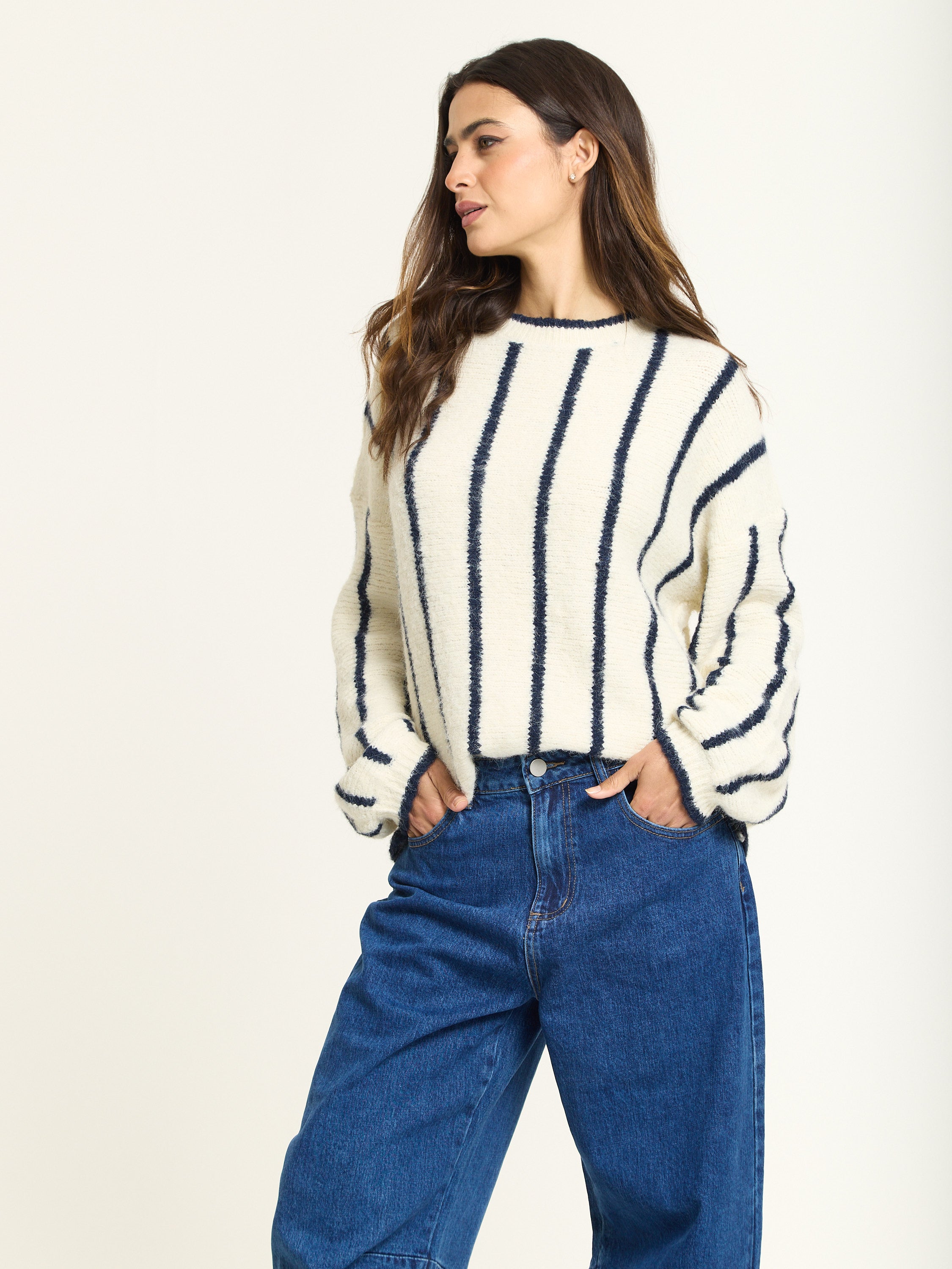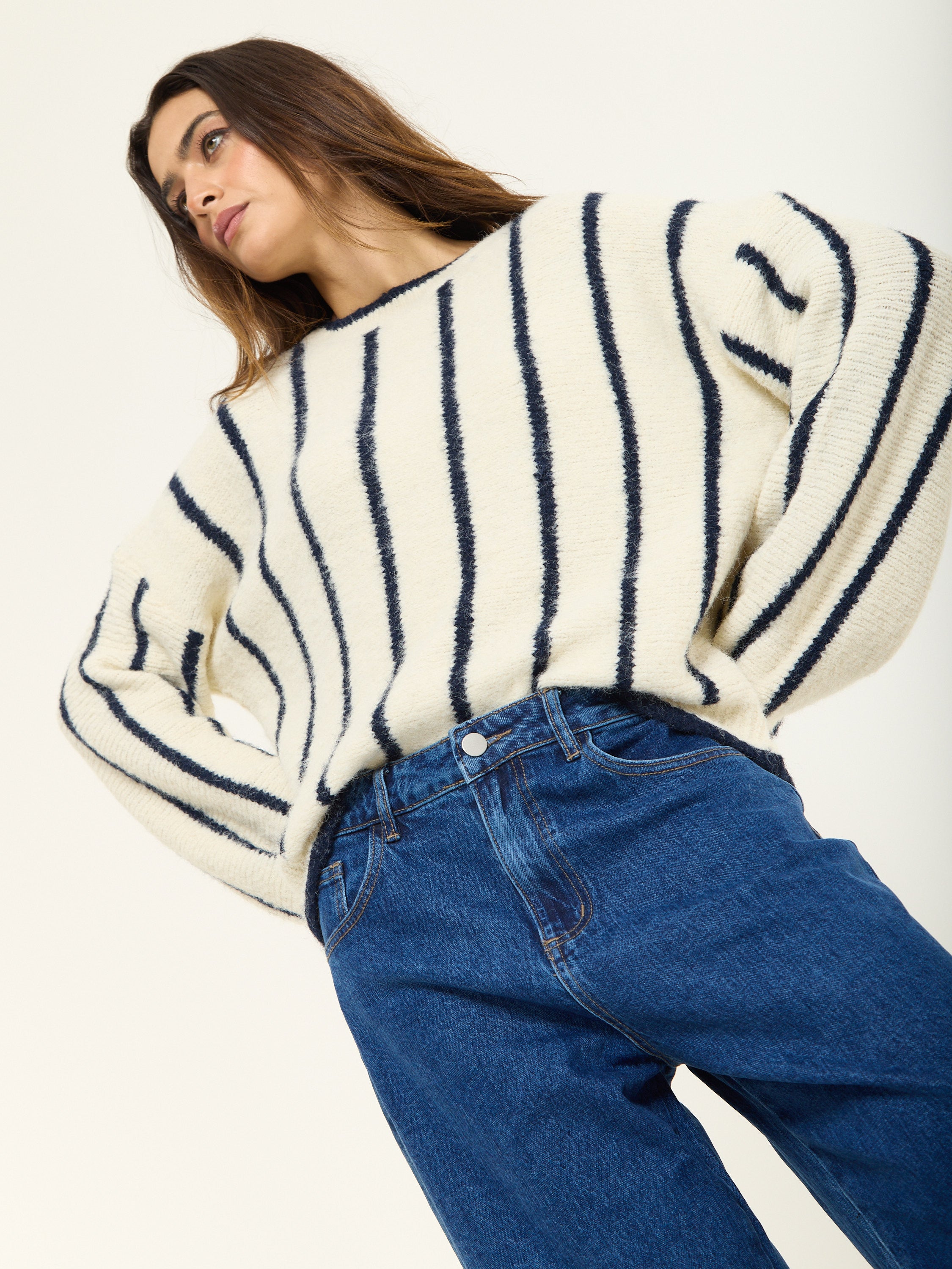 Pair it with wide-leg denim for a casual weekend look, or style with tailored trousers for an off-duty yet polished vibe. The versatile stripe pattern gives this jumper a timeless charm — think effortless layering and easy styling all season long.