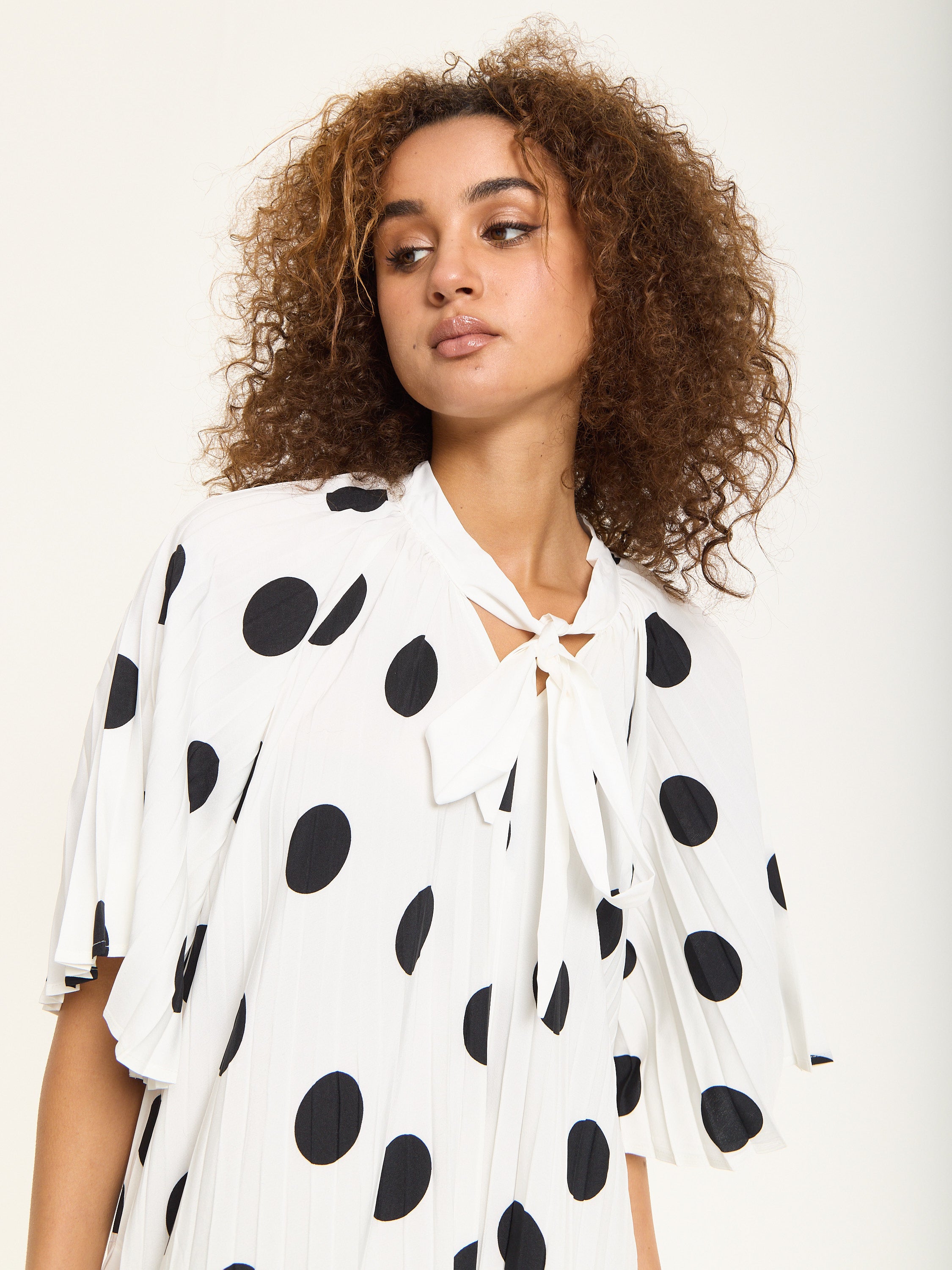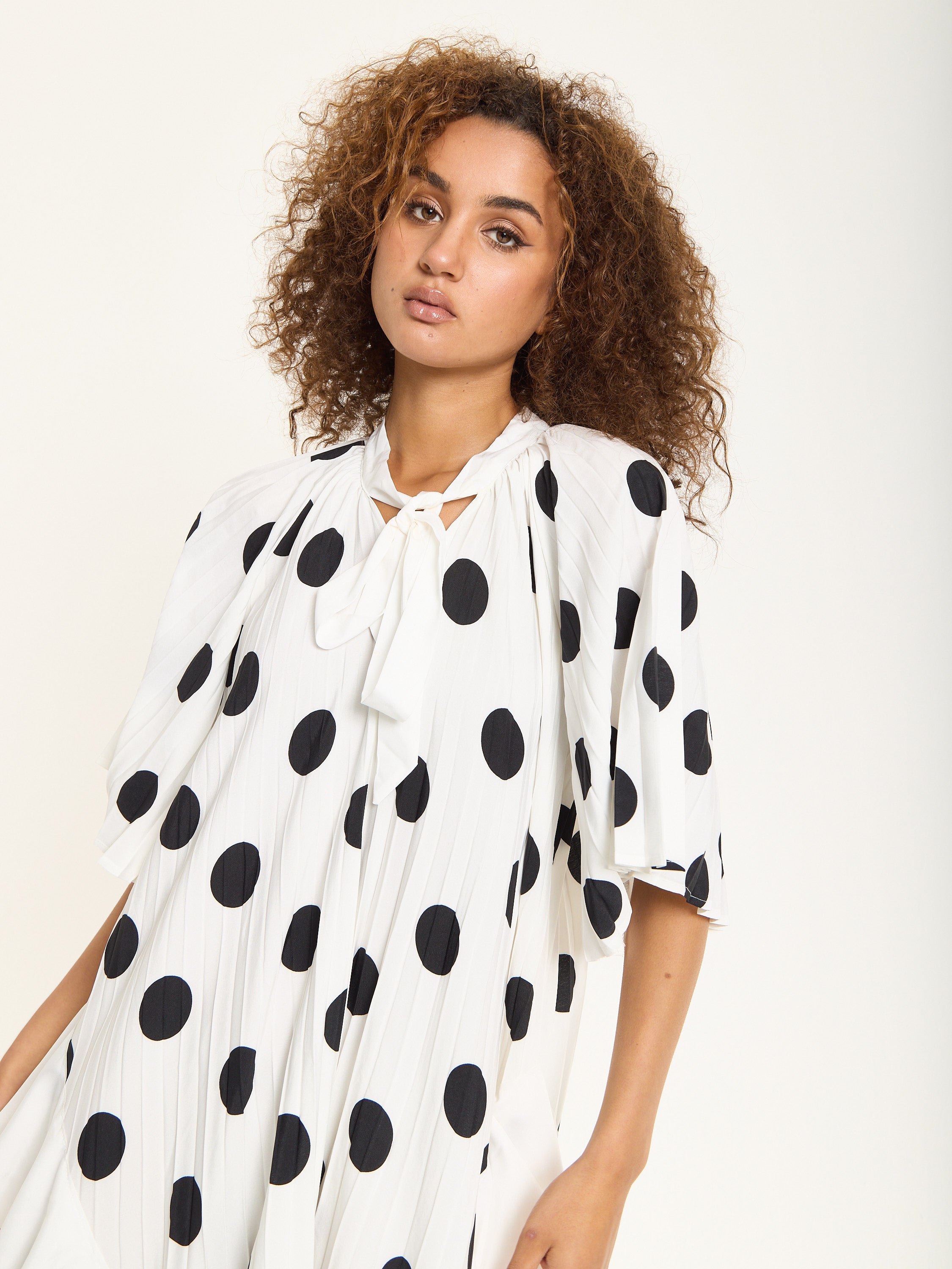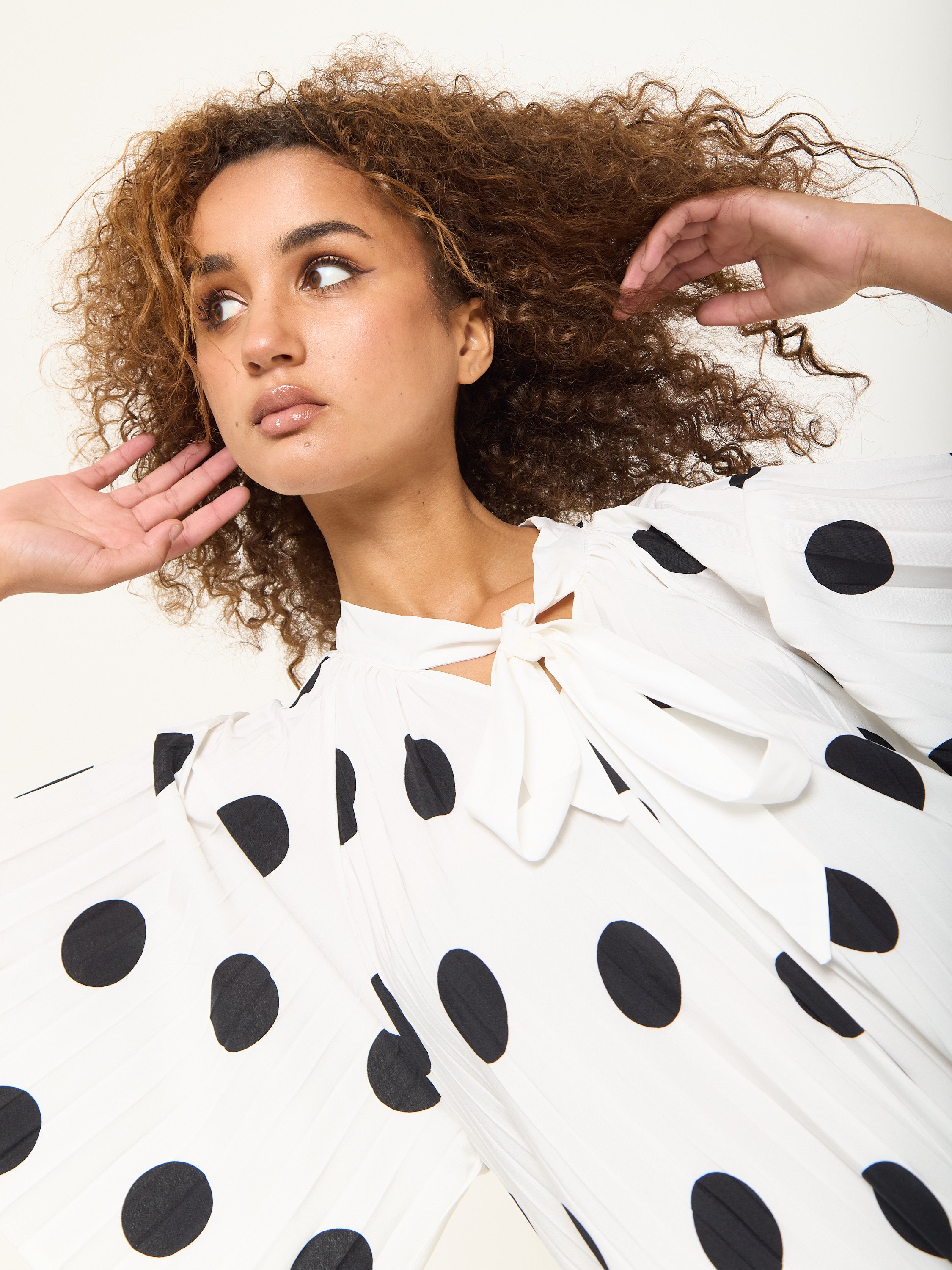 Tie Neck Polka Dot Pleated Ruffle Maxi Dress