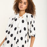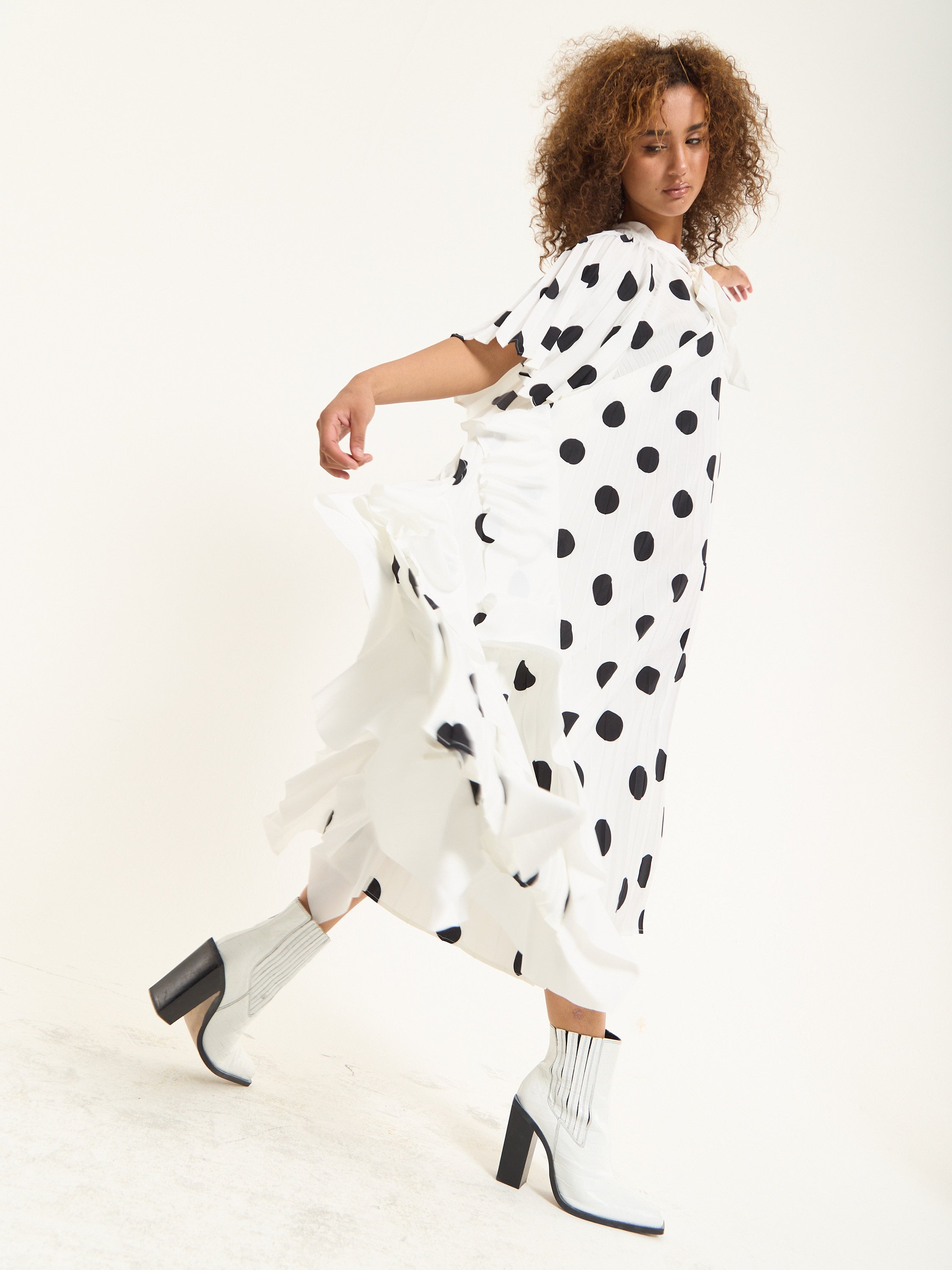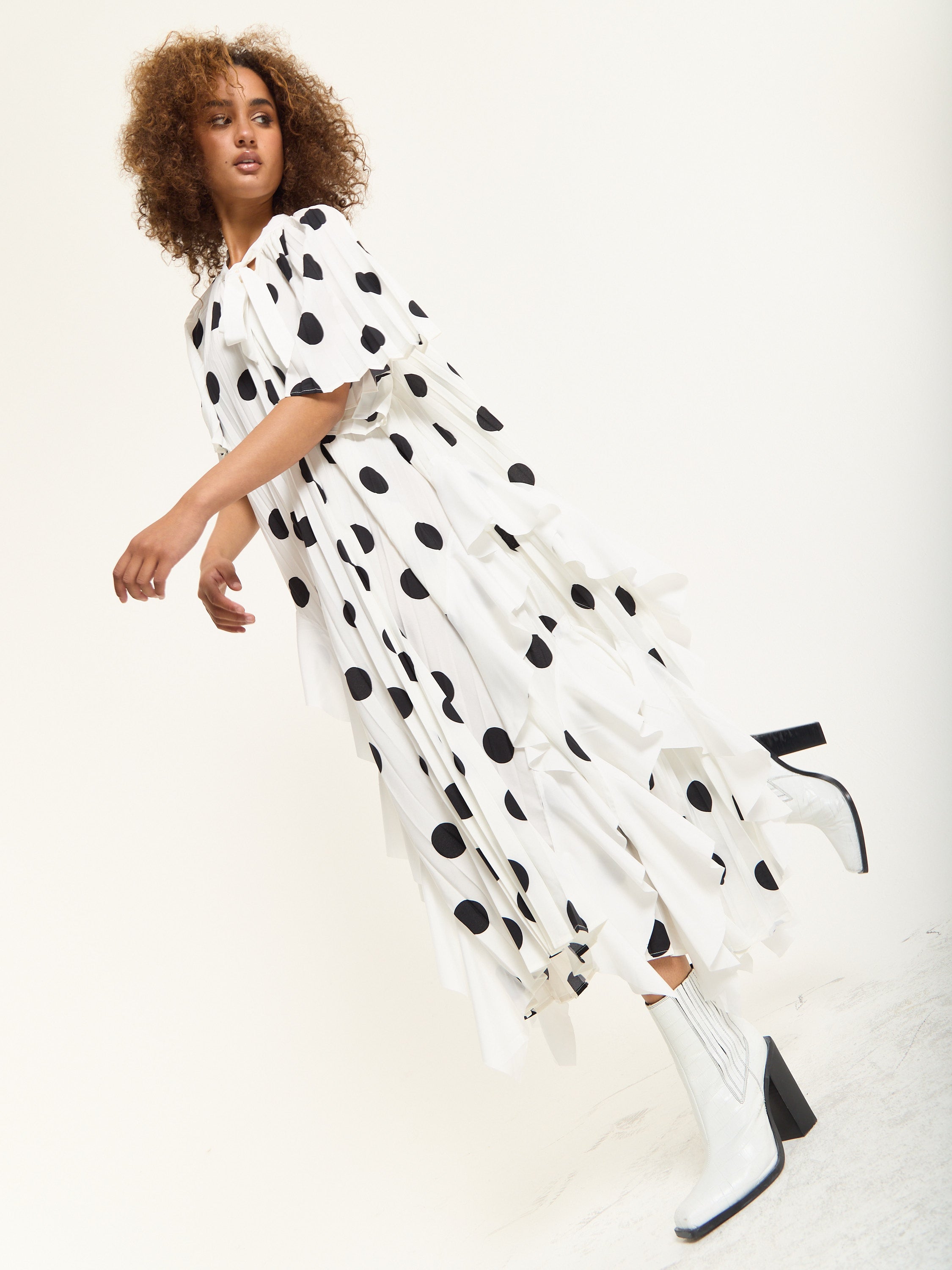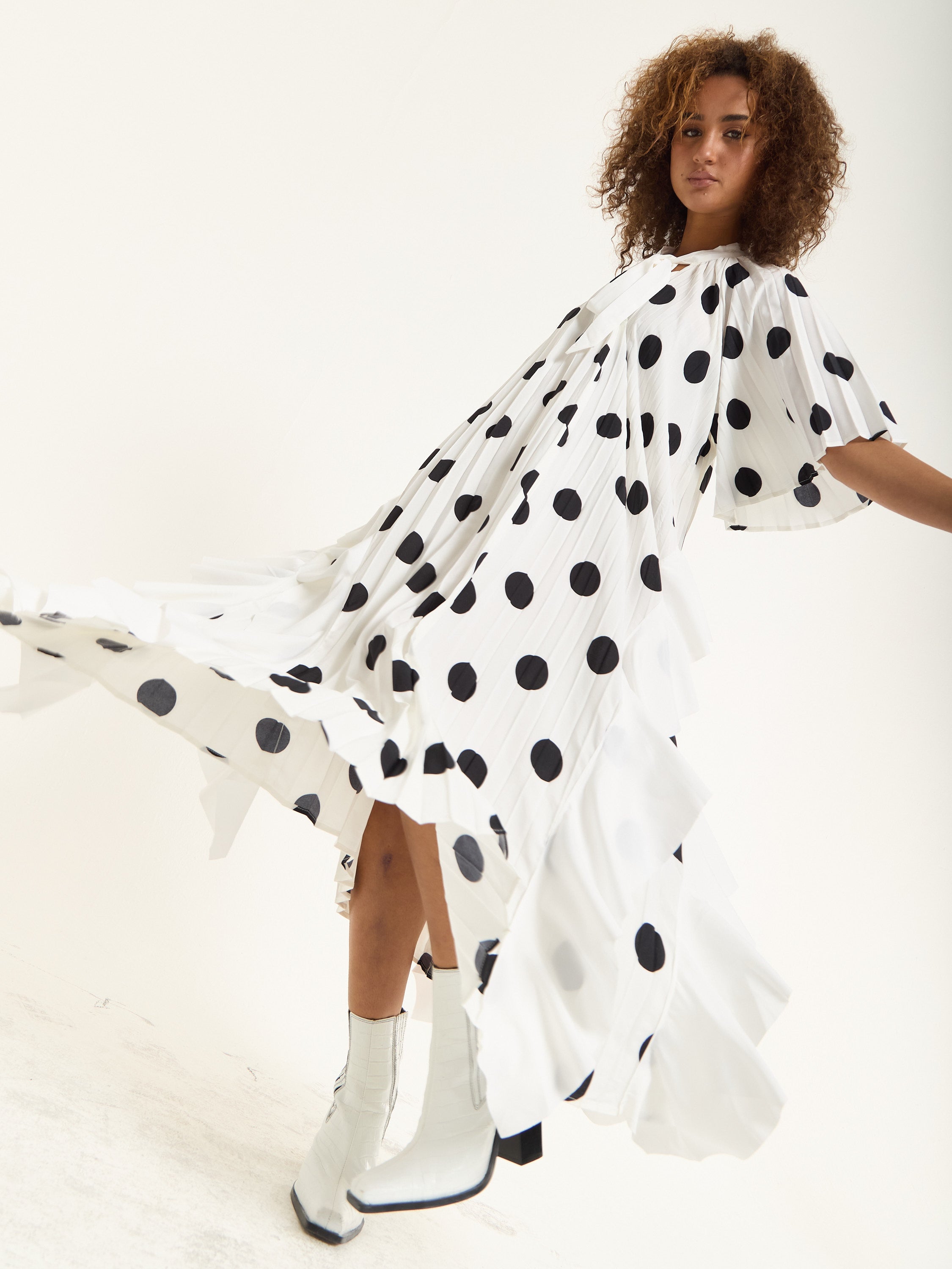 The House of Holland Polka Dot Ruffle Maxi Dress in White is a playful yet powerful statement piece. Featuring bold black polka dots across a pleated white base, this maxi dress moves with volume and energy. Its soft structure, dramatic ruffles, and floaty silhouette make it the ultimate day-to-night showstopper.