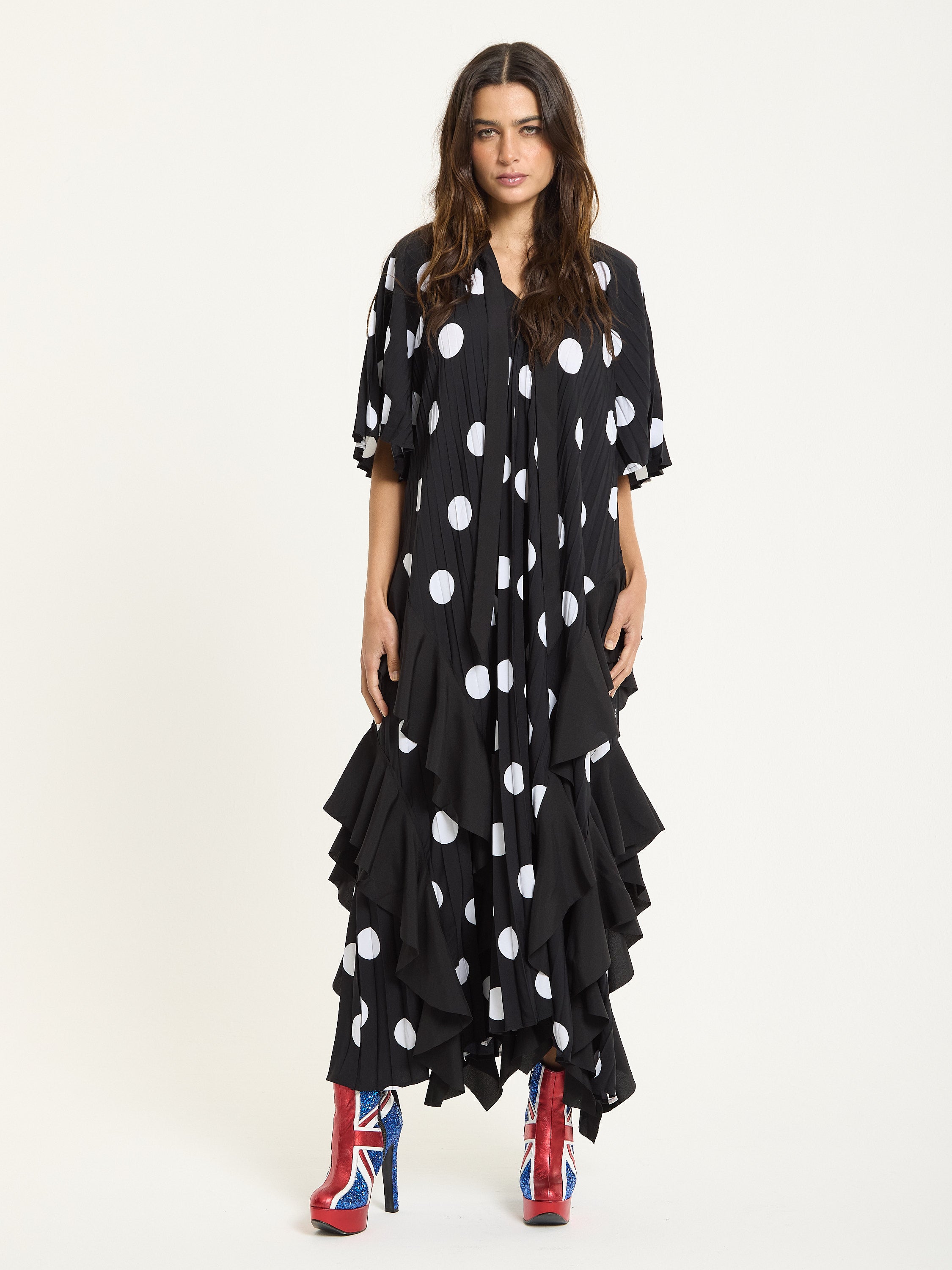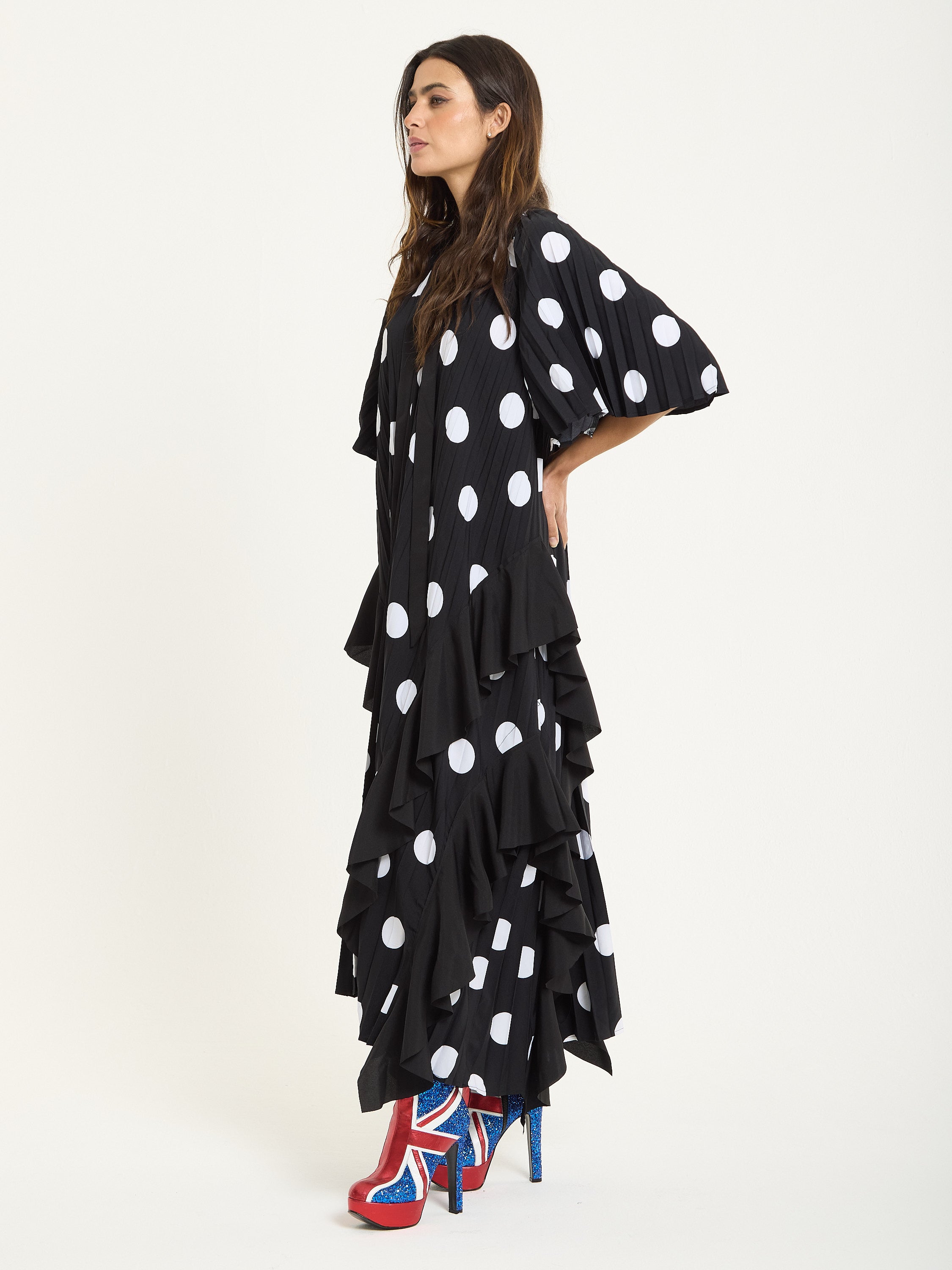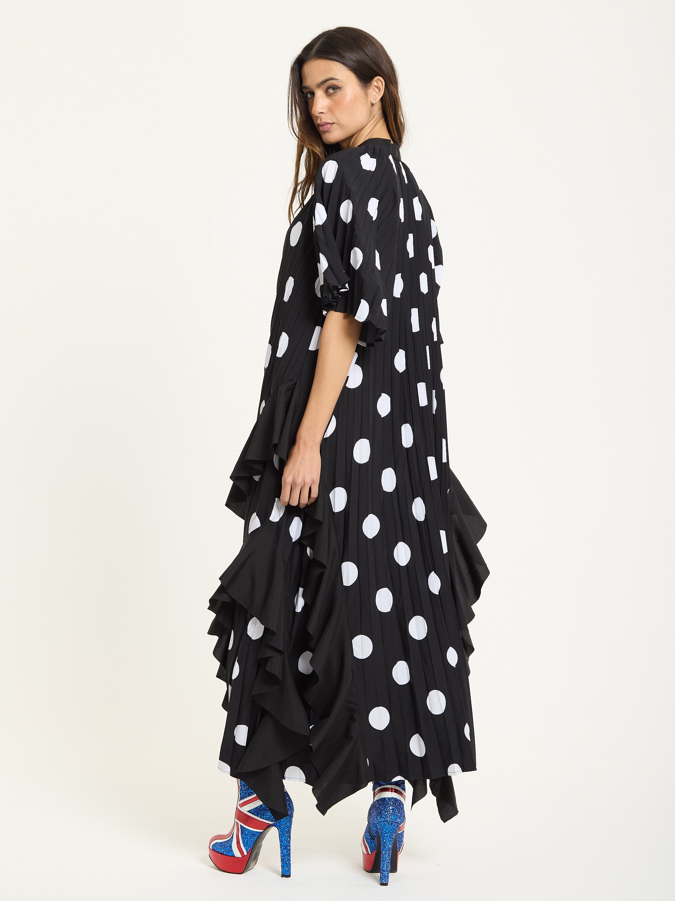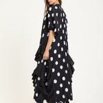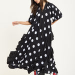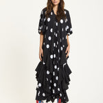 The House of Holland Polka Dot Ruffle Maxi Dress in Black brings bold attitude with a playful twist. Featuring oversized white polka dots on pleated black fabric, this flowing silhouette is detailed with asymmetric ruffles that move beautifully as you walk. The relaxed shape and dramatic hemline make it a standout piece for both day and night.