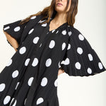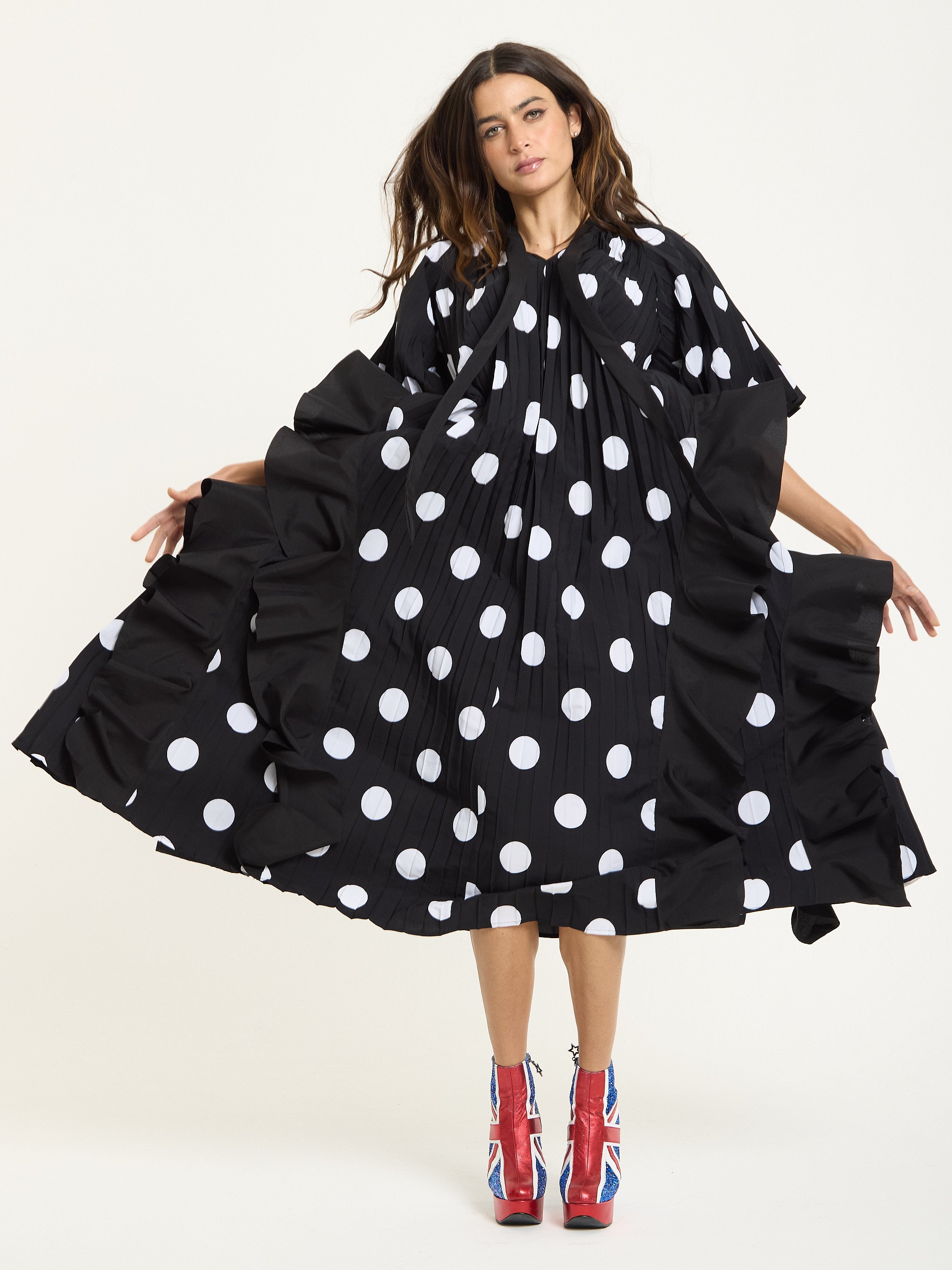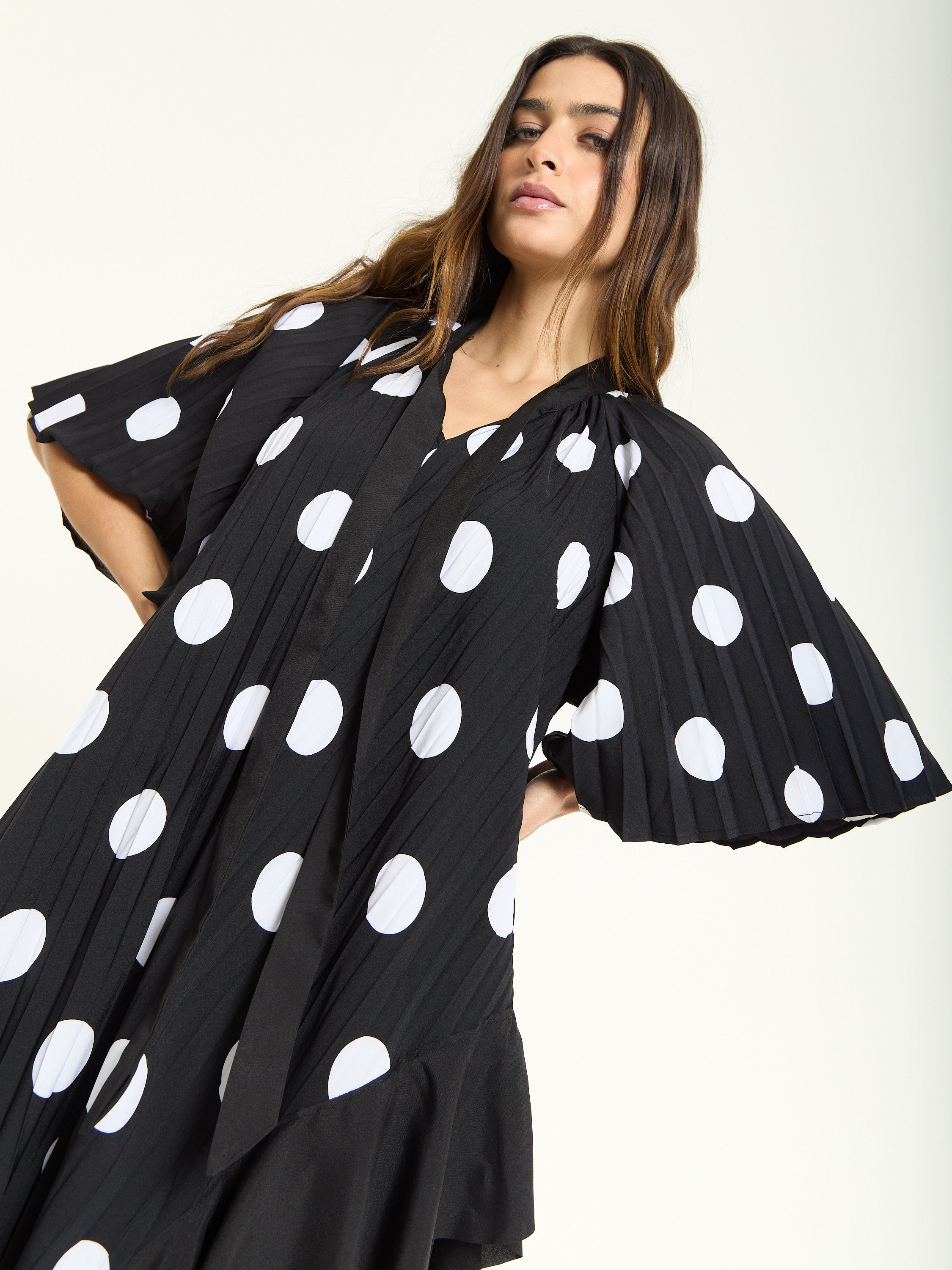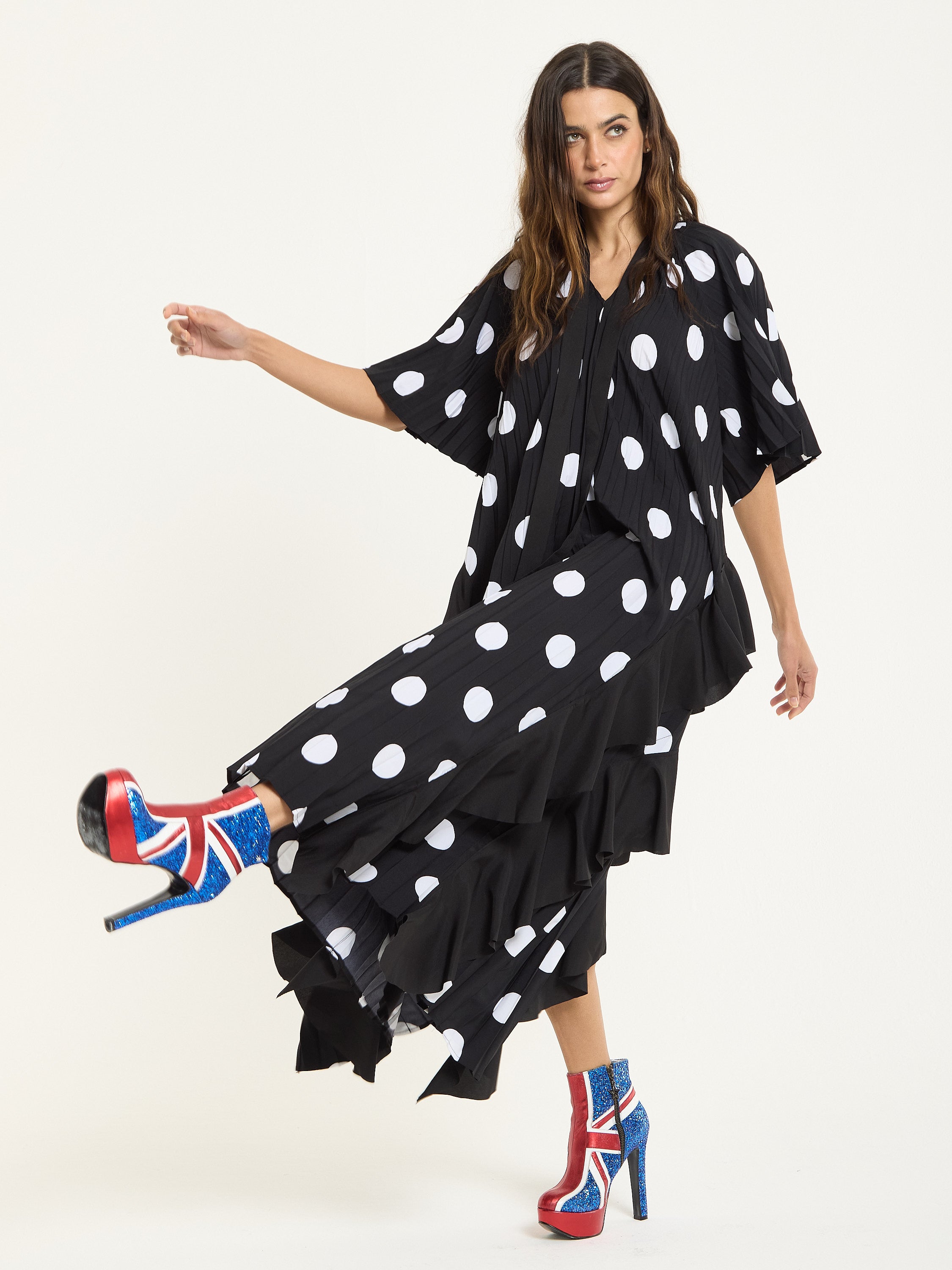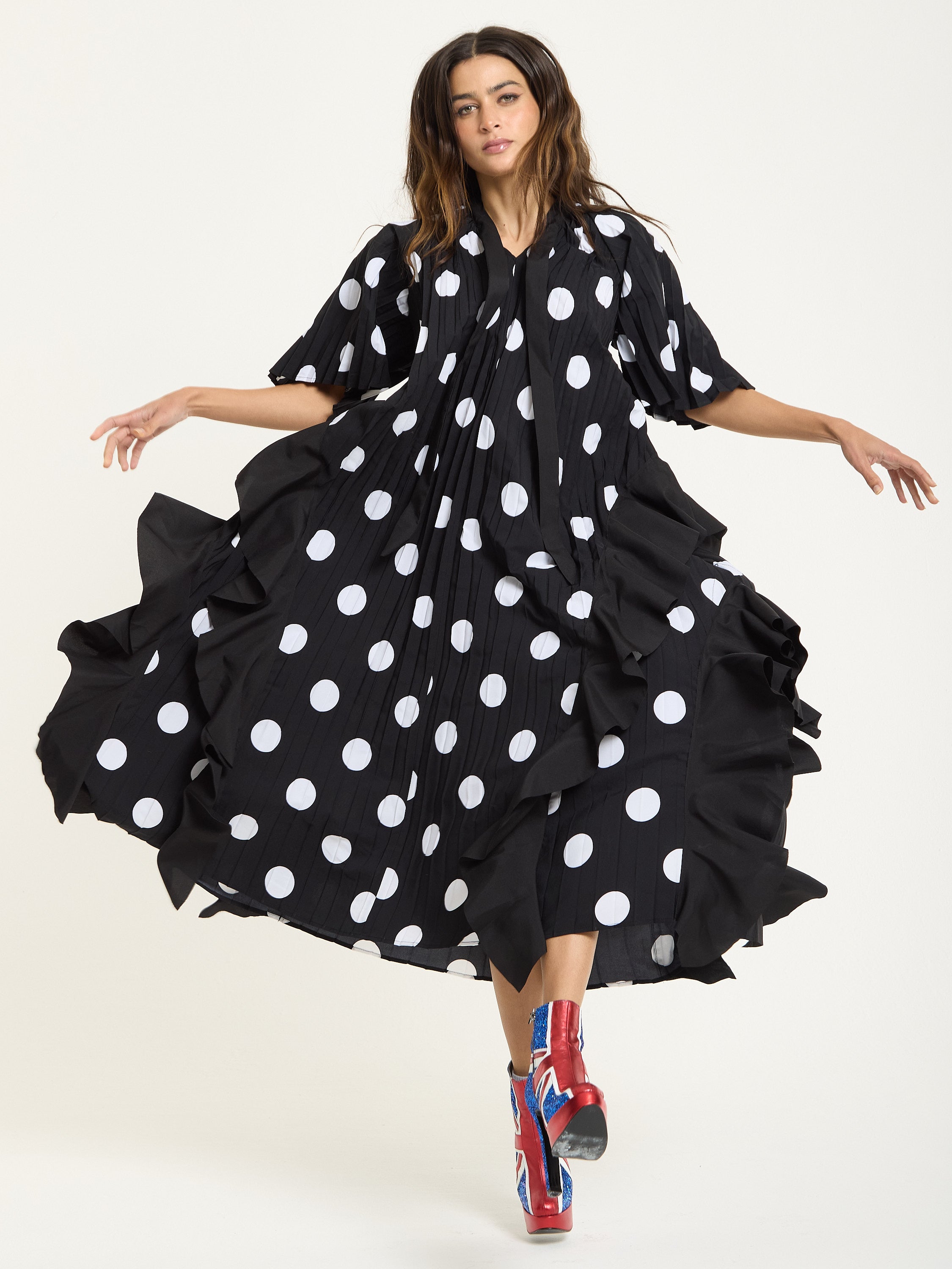 The House of Holland Polka Dot Ruffle Maxi Dress in Black brings bold attitude with a playful twist. Featuring oversized white polka dots on pleated black fabric, this flowing silhouette is detailed with asymmetric ruffles that move beautifully as you walk. The relaxed shape and dramatic hemline make it a standout piece for both day and night.