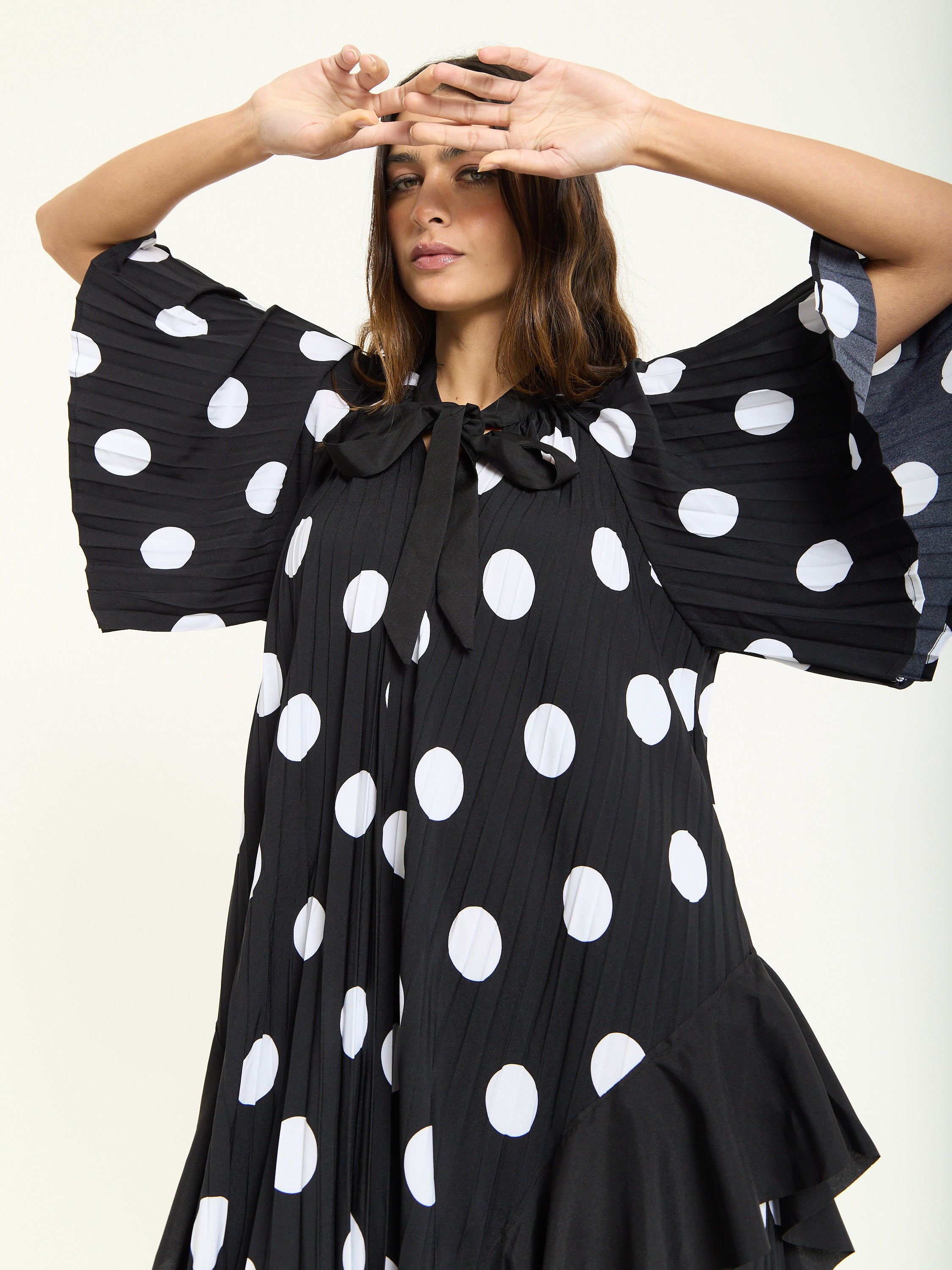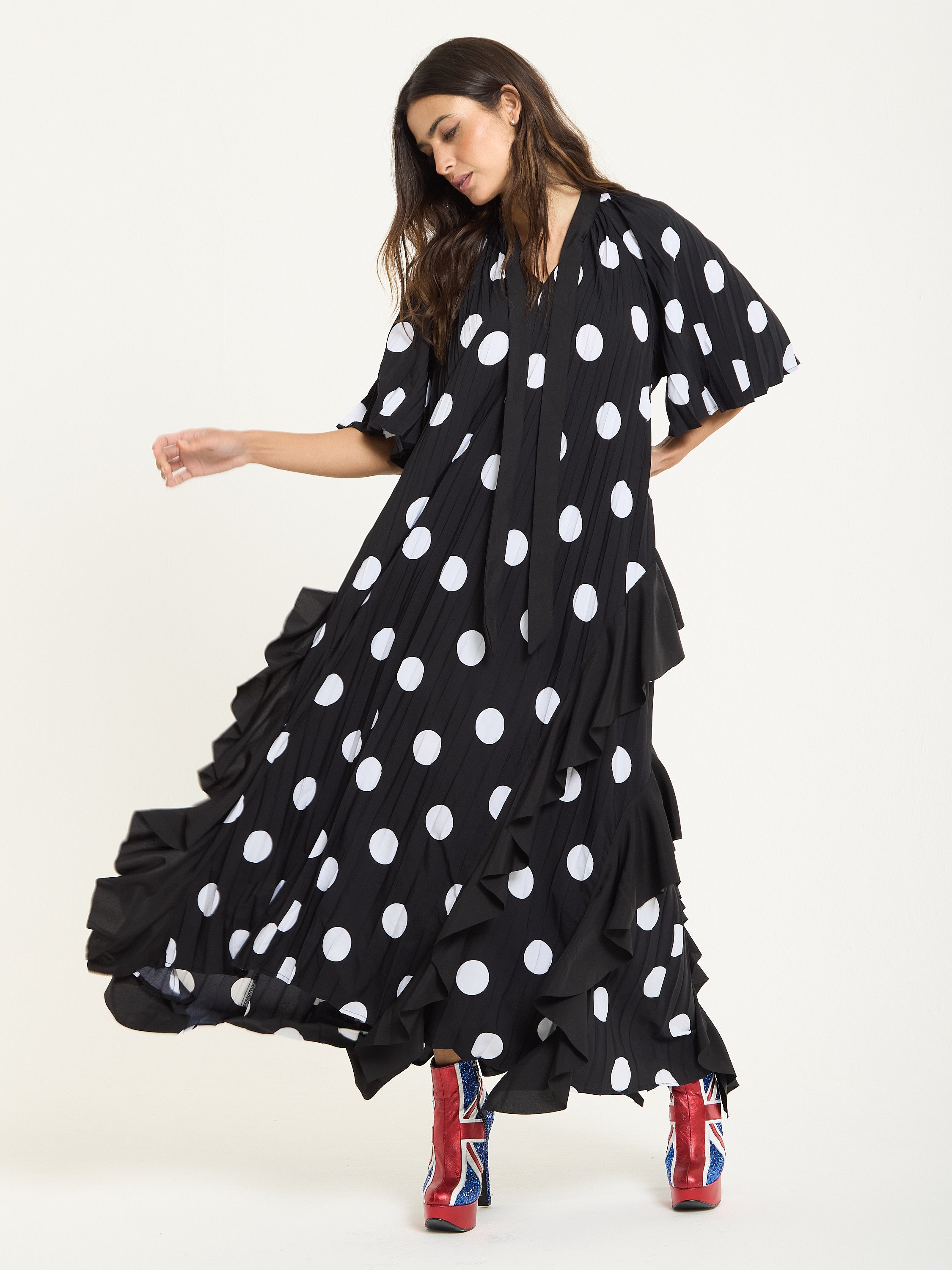 Tie Neck Polka Dot Pleated Ruffle Maxi Dress
