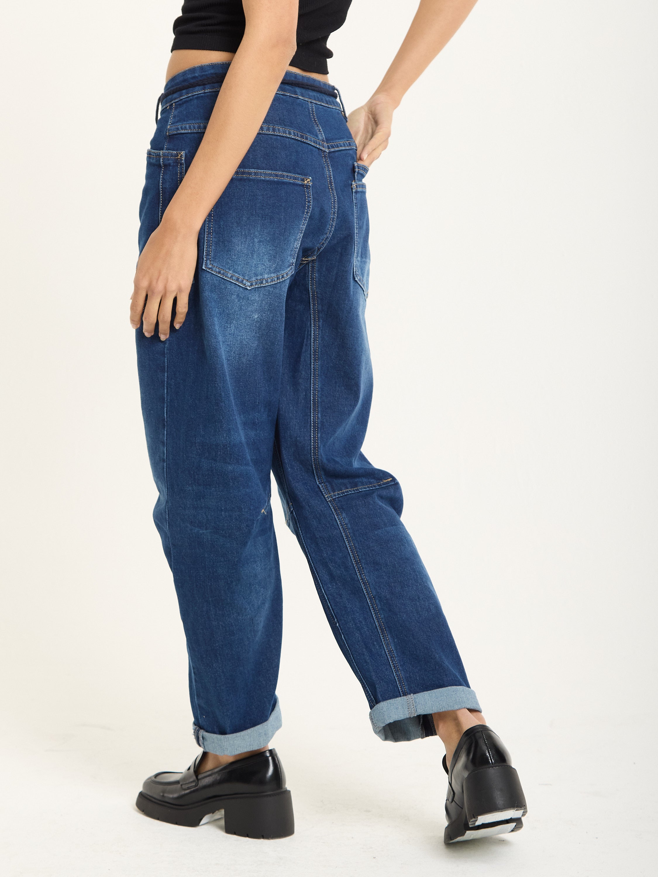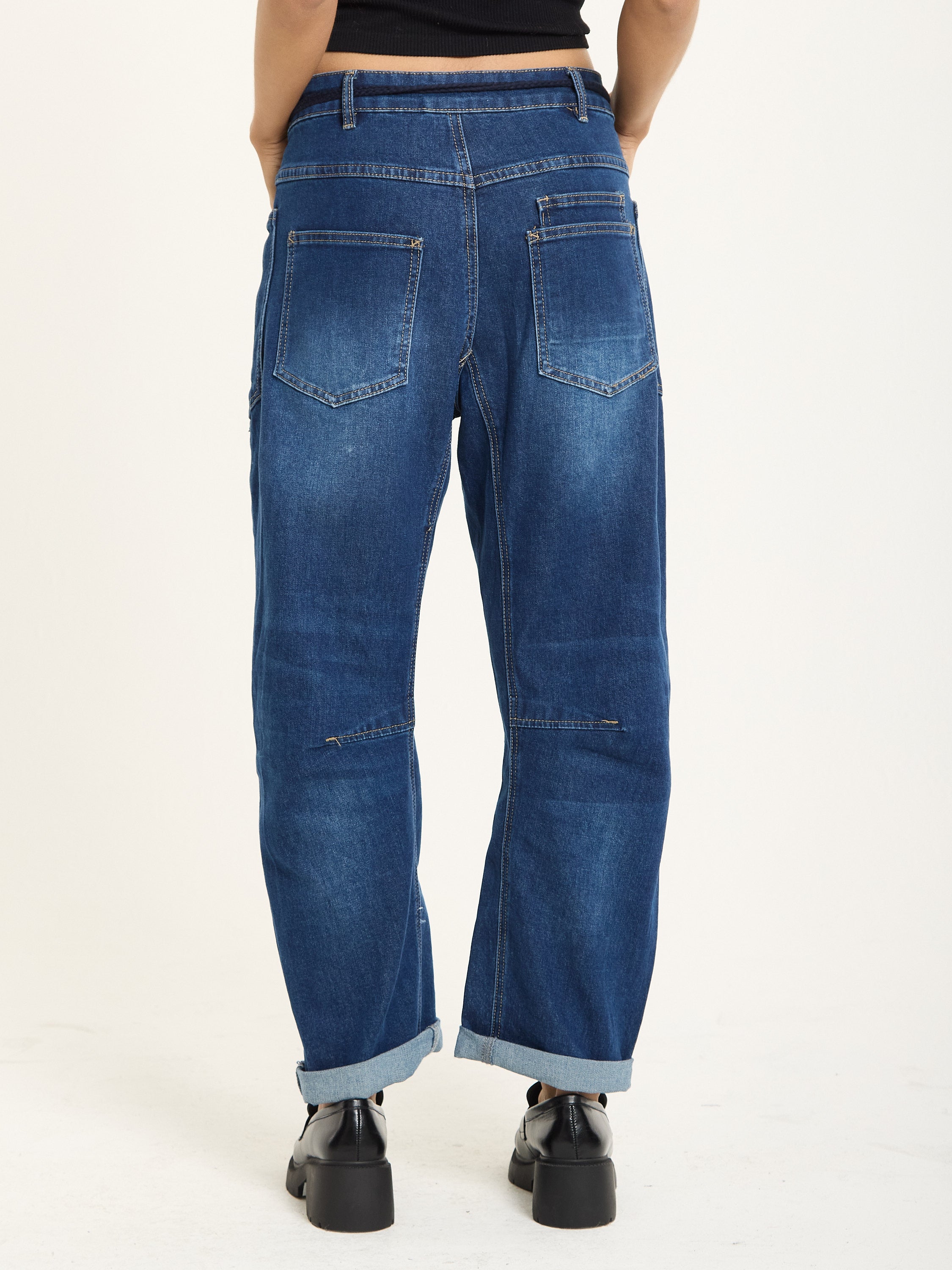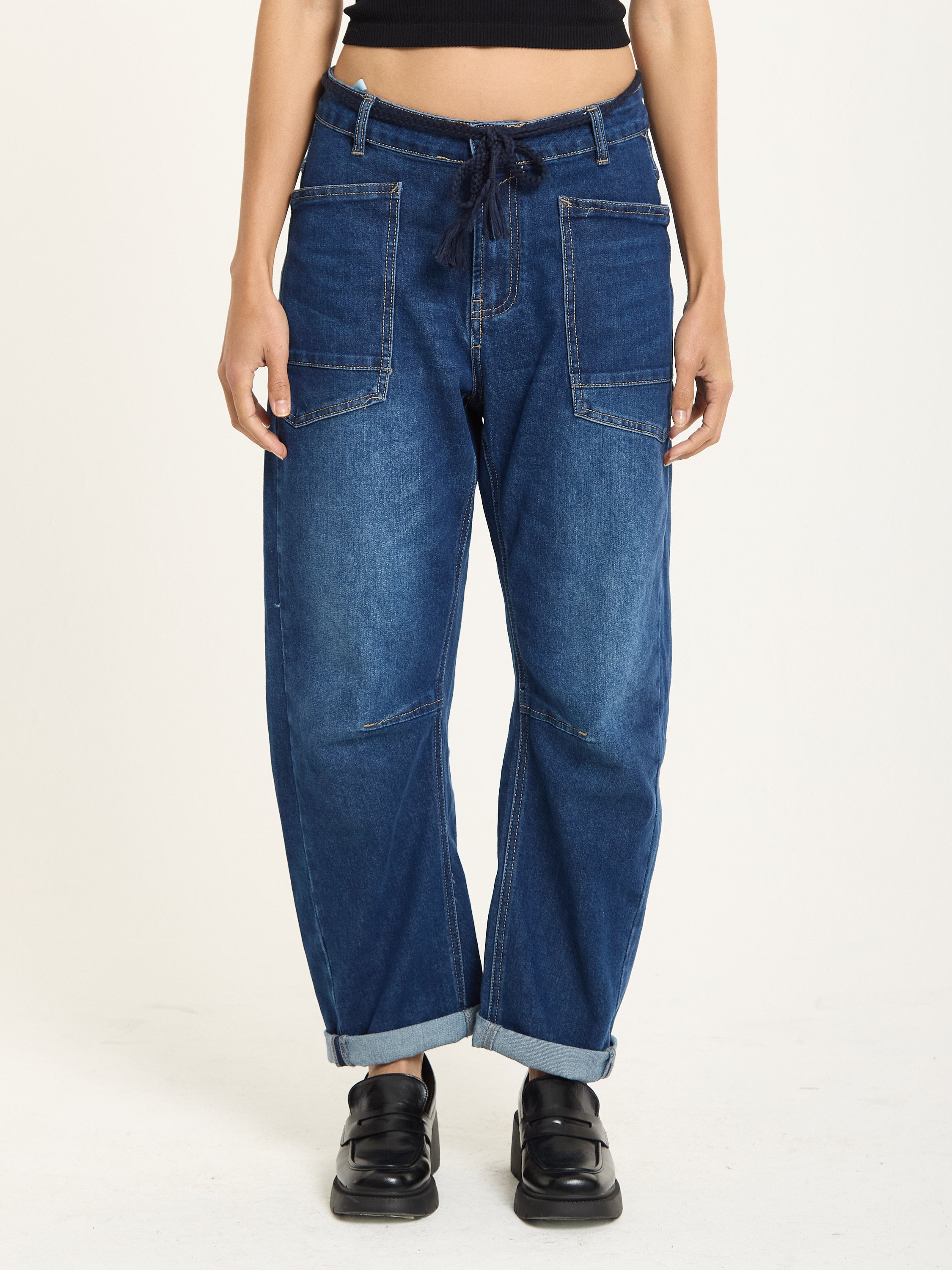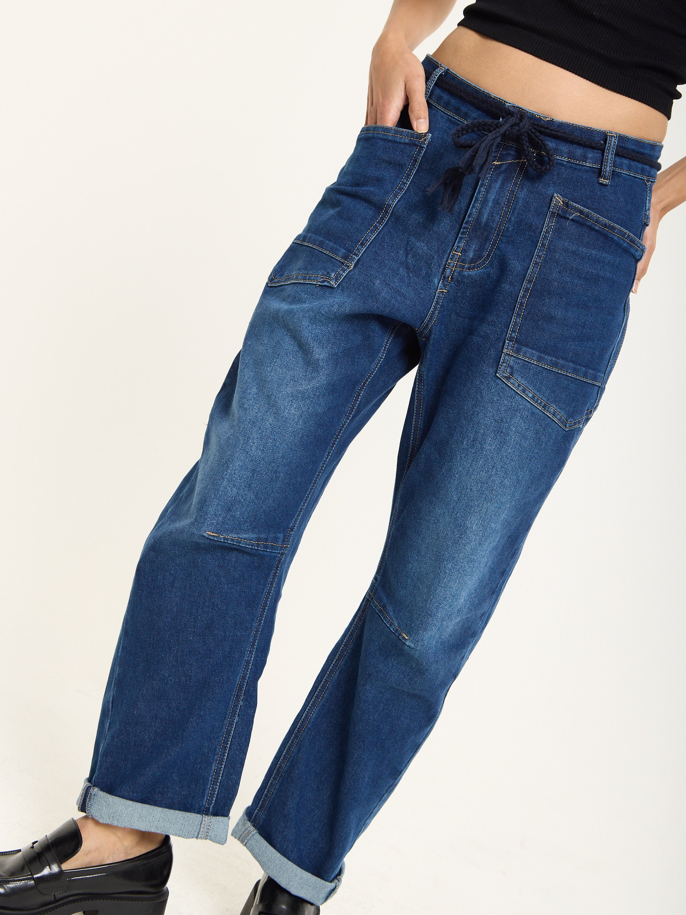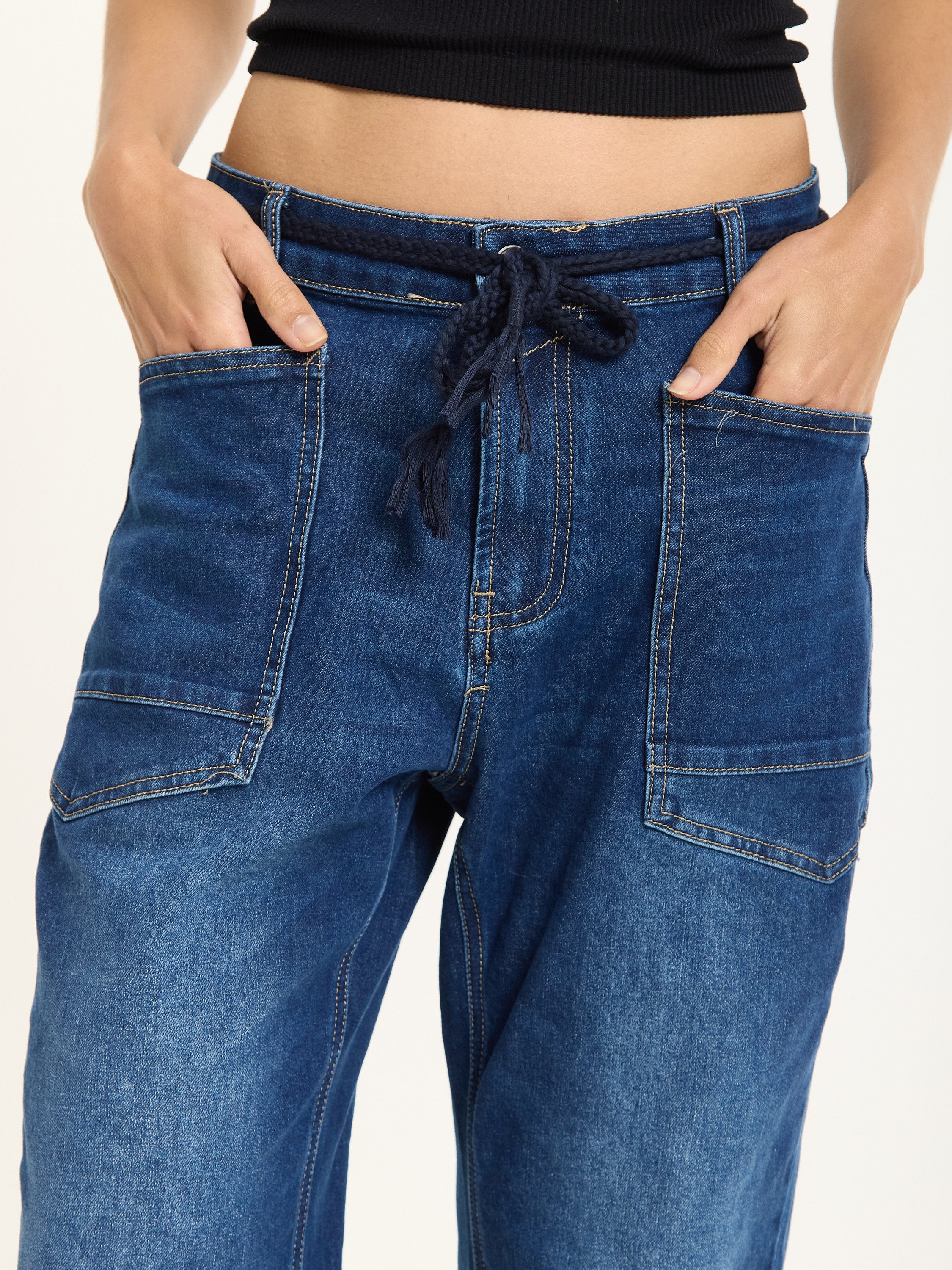 Relaxed-fit utility jeans crafted in classic blue denim. Designed with large front patch pockets, back pockets, and visible seam detailing for a casual, workwear-inspired look. The drawstring waistband adds a laid-back touch while ensuring comfort and adjustability.